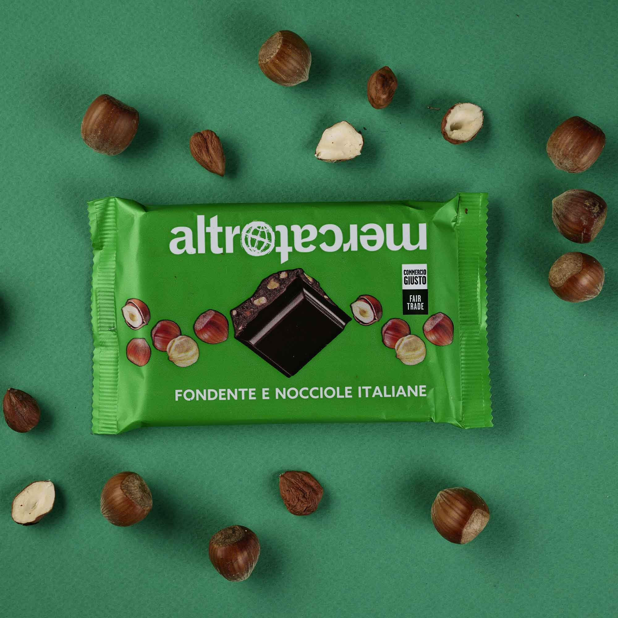 Una tavoletta di cioccolato fondente con granella di profumate e croccanti nocciole Italiane: i sapori si incontrano e si fondono per il massimo del piacere gustativo. Con fave di cacao dalla Colombia coltivato con metodi agroforestali e zucchero di canna da commercio giusto.