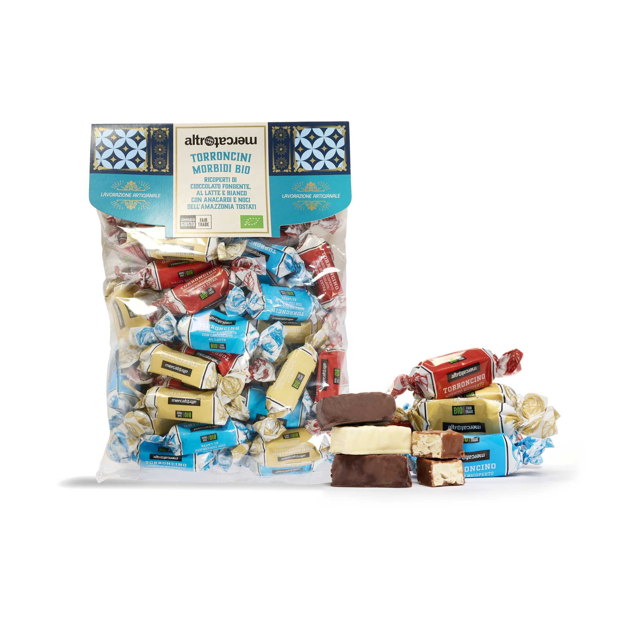 I nostri torroncini sono il frutto di ingredienti equosolidali sapientemente lavorati da artigiani torronieri secondo tradizione. La copertura ai tre cioccolati (cioccolato fondente extra, al latte e bianco) avvolge un morbido ripieno di miele da fioritura spontanea, zucchero di canna e deliziose noci dell’Amazzonia, regalandoti un morso buono per te e per tutti.