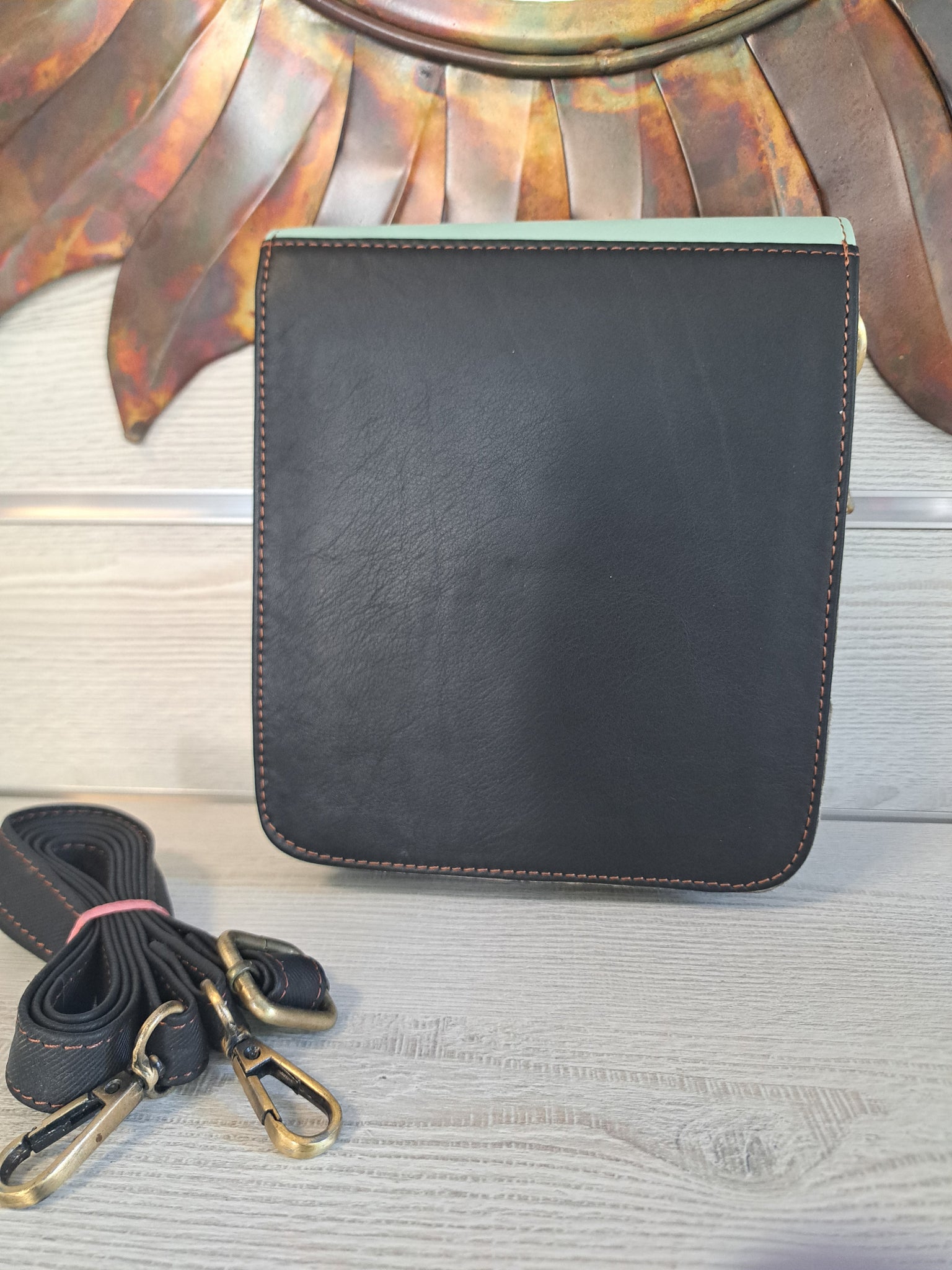 Borsetta rettangolare con tracolla, quattro scomparti uno nascosto con zip.