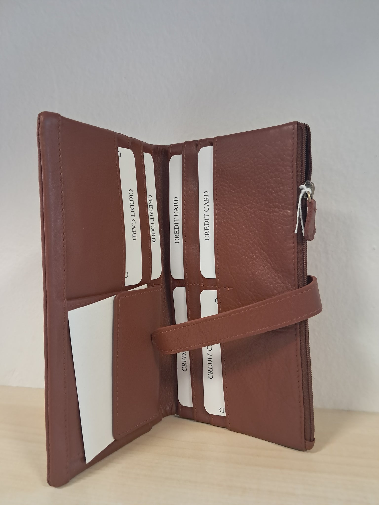 Portafoglio donna piatto in morbida nappa bovina, presenta un'ampia tasca con chiusura zip in testa, due scomparti per le banconote, uno per le monete e vari porta carte. Interno foderato in cotone a righe. Chiusura esterna con cinturino.