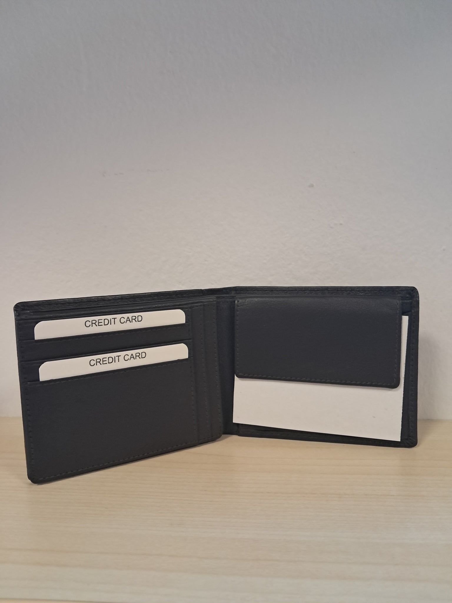 Portafoglio uomo in morbida nappa bovina con due scomparti per banconote, vari spazi per le carte. Una tasca portamonete a soffietto con bottone a pressione. Interno foderato in cotone a righe.