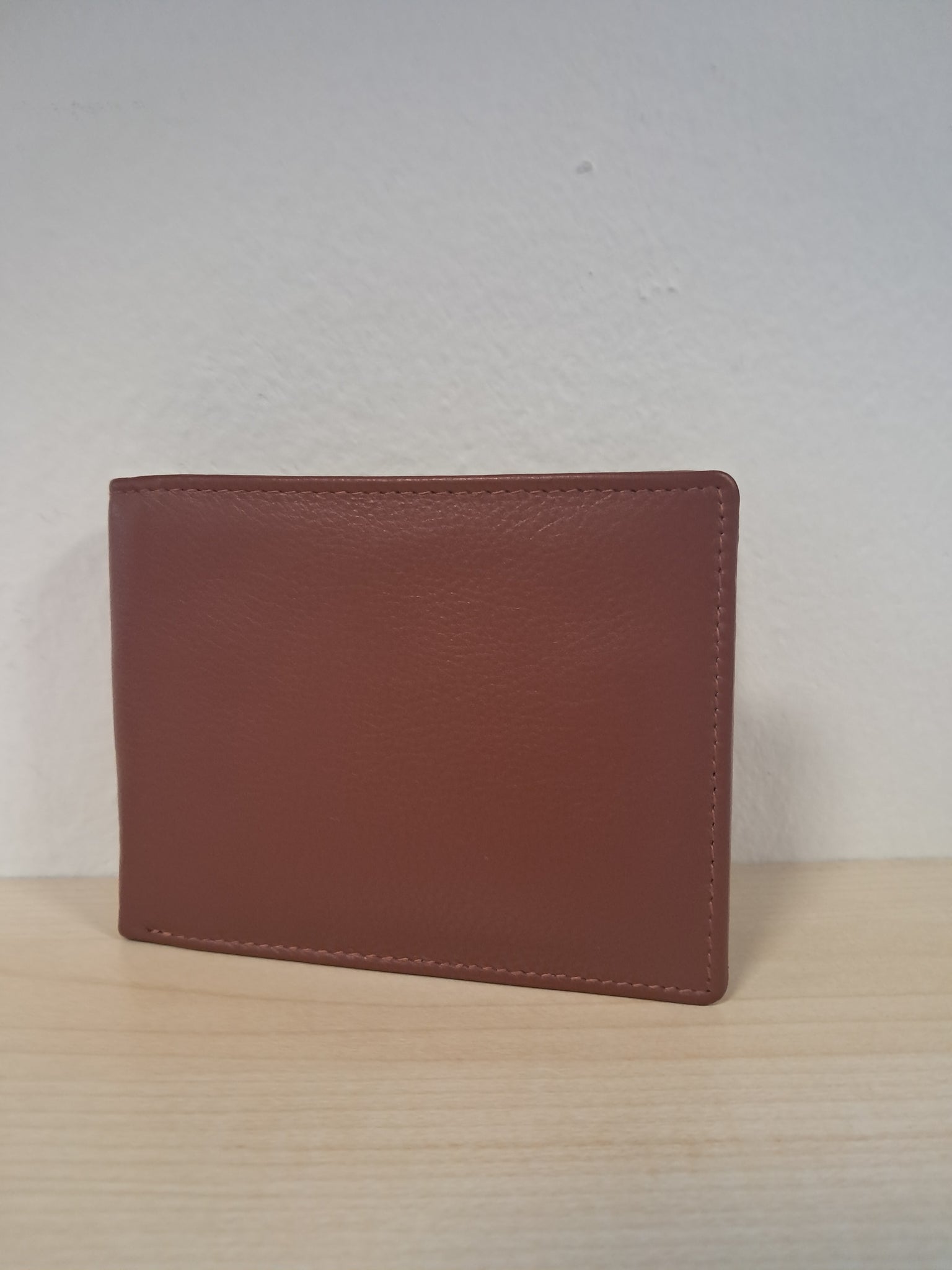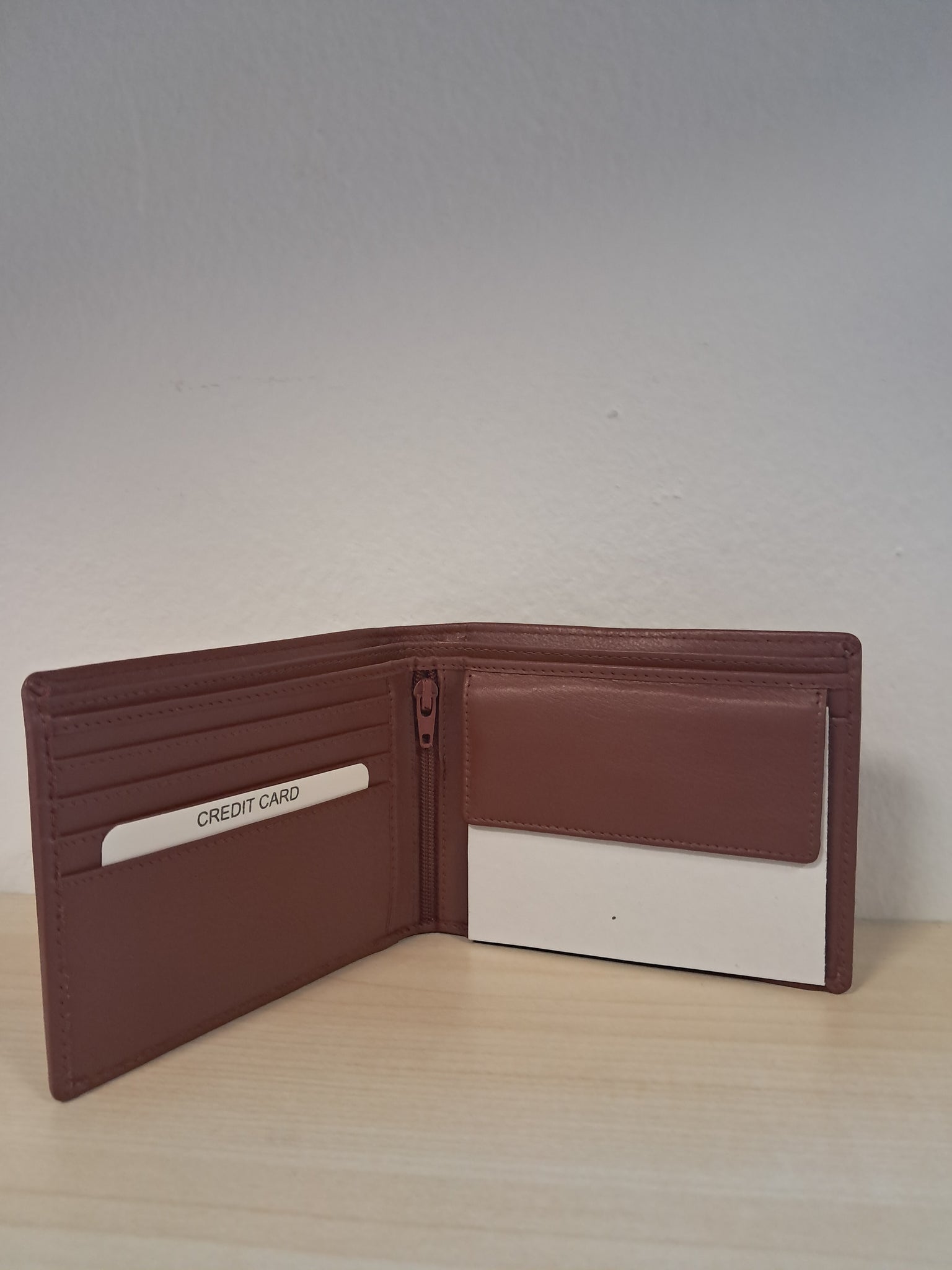 Portafoglio uomo in morbida nappa bovina con doppio scomparto per banconote, quattro spazi per le carte di credito, uno scomparto interno con zip, tasca portamonete a soffietto con bottone a pressione. Interno foderato in cotone a righe.