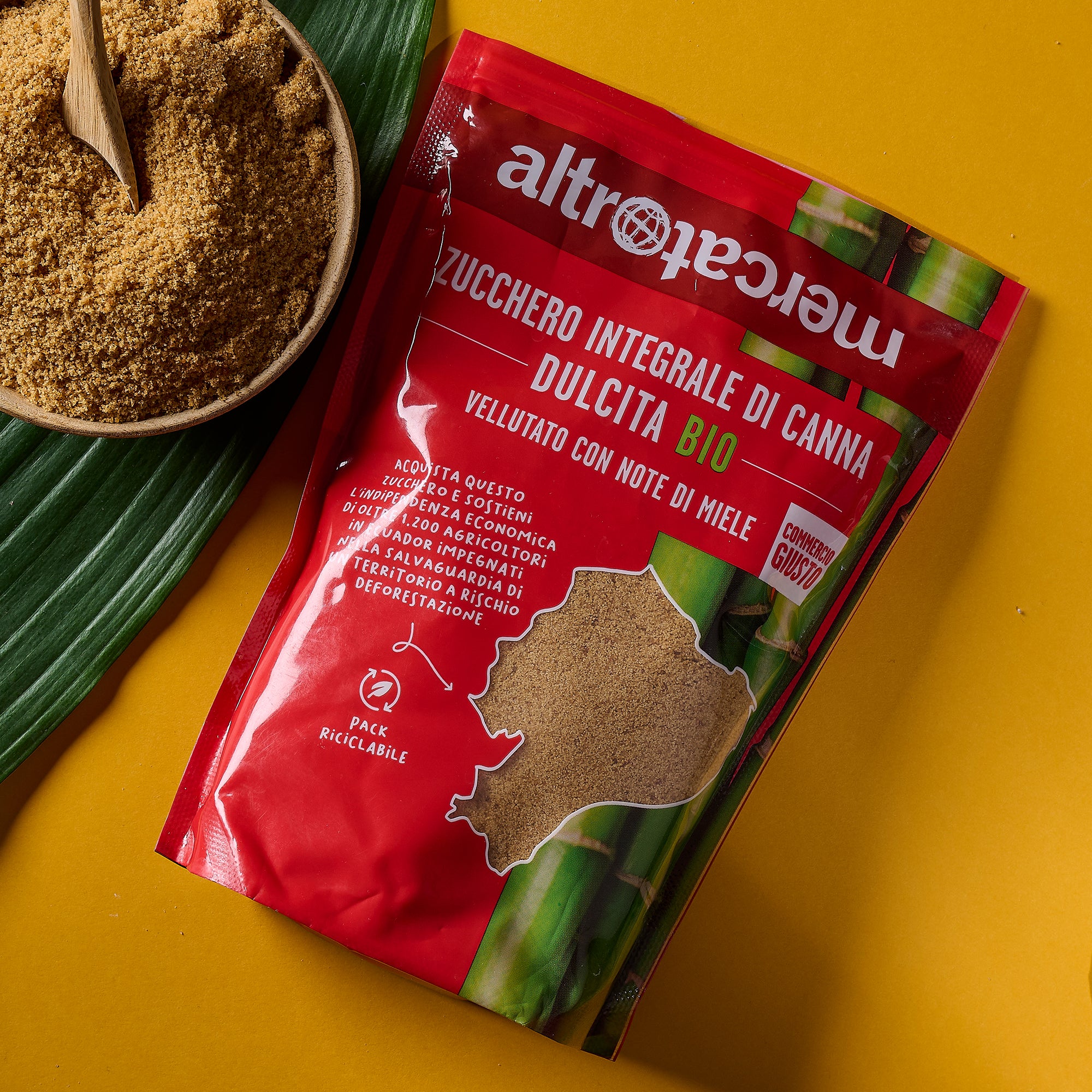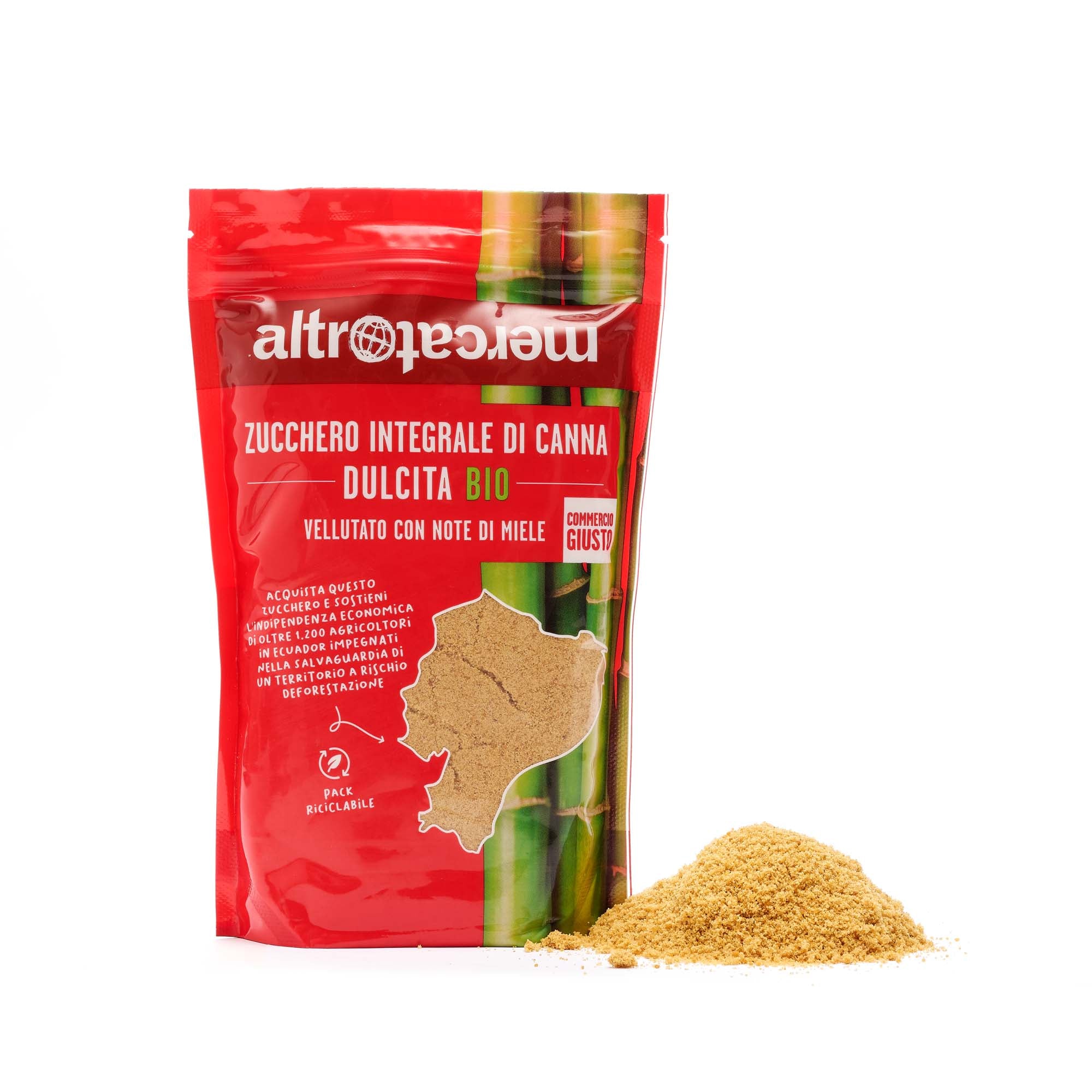 Zucchero di canna integrale e biologico, non sbiancato chimicamente. La naturale presenza di melassa gli conferisce il caratteristico colore ambrato. Viene estratto al 100% da canna da zucchero dell'Ecuador, con un procedimento artigianale che ne preserva la qualità e la ricchezza nutritiva.