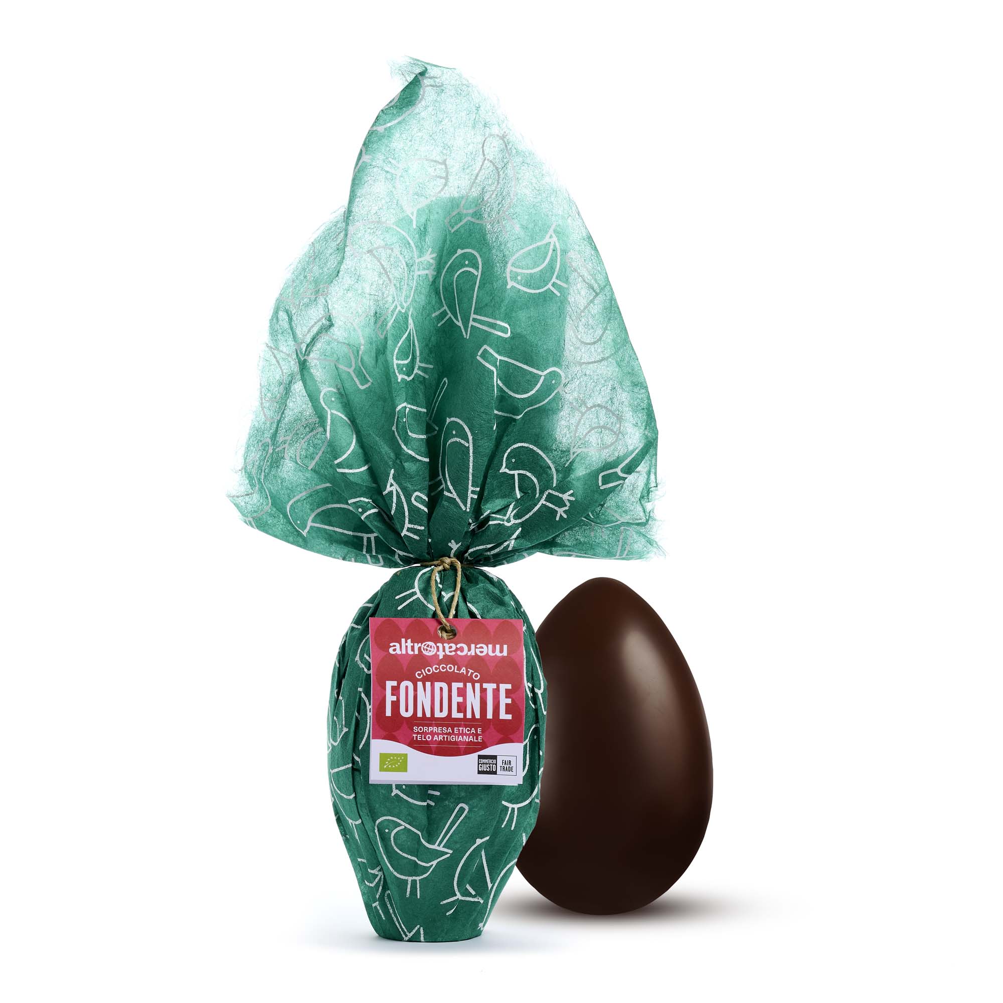 Uovo di pregiato cioccolato fondente biologico, realizzato con cacao e zucchero di canna equosolidali. All'interno una fantastica sorpresa: oggetti lavorati e decorati a mano con tecniche tradizionali, vengono realizzati dagli artigiani di Selyn in Sri Lanka. Anche la confezione è speciale: viene creata in carta seta artigianale dalle donne di Prokritee e decorata a mano, disponibile in azzurro e giallo. Potrai divertirti a riutilizzarla nel rispetto delle persone e dell'ambiente. (Al momento dell'acquisto il colore della confezione verrà automaticamente assegnato tra quelli illustrati in foto).